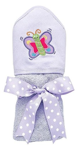 AM PM Kids, The AM PM Kids Butterfly Baby Hooded Bath Towels are 30 inches wide and 30 inches high (including the hood). The towels and hoods are made of 100% cotton terry and the hoods have an outer soft knit layer to allow for colorful and vibrant applique designs. These warm and cuddly hooded bath towels make a great gift for babies and infants. The hooded towels are lavender in color with lavender trim and come tied with a contrasting ribbon for a great looking baby gift. This hooded towel can be personalized at the Stitch Sensations web site.